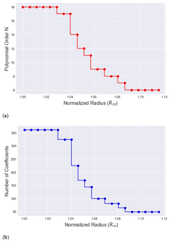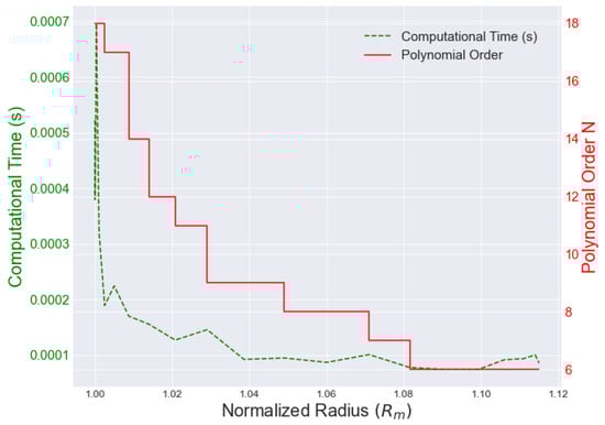 For cosine sampling, the number of CGL nodes was highest near the surface and would decrease as the radii increased. The number of sample nodes should decrease as nodes are related to the number of coefficients used in the polynomial approximation at a specific radius. In order to find the best node quantity for each radius, the routine is iterated through uniform node values at each radius until a node value produces an error greater than a tolerance of . Because the number of CGL nodes is related to the polynomial order, the goal is to further investigate by observing how the polynomial order affects computational time. With this, an analogous relationship is observed between CPU time and polynomial order (as expected). Figure 7 illustrates a decrease in time cost as a function of radius alongside the polynomial order decreasing in the same manner, confirming the idea that it takes a longer period of time to approximate at higher polynomial orders than at lower orders.