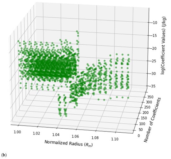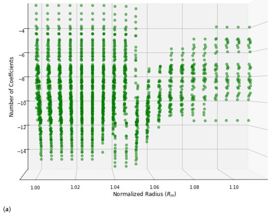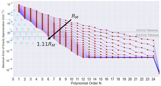 For higher-precision orbit propagation, all terms used in the LP spherical harmonic model are considered. As mentioned in the approximation theory, an error tolerance of is selected while substituting the high-degree order gravity model with a FEM approximation. Figure 8 showcases the maximum absolute error of the approximated norm of the “disturbance” acceleration as a function of the Chebyshev polynomial order N. Here, it is noted that as the radius increases, the error declines faster; a smaller polynomial order is sufficient enough to reach the placed error tolerance of . However, in this plot, it is clear that there are two error tolerance values displayed. In the previous analysis, a polynomial order of 21 is identified that yielded an error of . However, after reviewing the coefficient values in this polynomial order, it is found that the portion of corresponding errors was much smaller than allowed error tolerance. This suggests that this polynomial order was significantly implementing a high precision that was computationally expensive. With this, a “fetching” routine is implemented where any error values less than our error tolerance had their corresponding coefficient value to be approximated to 0.