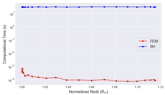 For all three approaches, the initial ranges of and and R are used to generate satellite accelerations using the FEM routine and the LP SH routine. In the FEM analysis, the coefficients saved from the original model at were multiplied by the Chebyshev polynomials approximated at each elevation and azimuth. These results are then compared to SH results for computational time and error. Figure 15 displays the computational time for both approaches for each of the three tests for each of the three radii. For all three tests, FEM timing is three to four orders of magnitude smaller than that of SH.