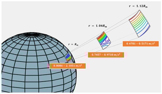 At an arbitrary radius, r in the range of , let the gravity data be provided at a constant radius, r, on a specific spherical shell. These data on this shell should be transformed into , where and ; we can retrieve an accurate gravity modeling representation of on “sufficiently-dense” sets of concentric spherical surfaces. However, sampling radial coordinates is key when considering this unique variation.