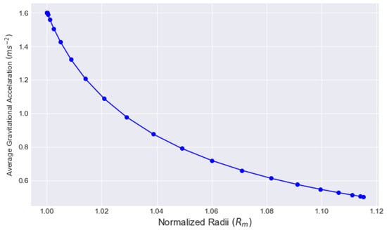 With a maximum degree order of 100 and shell sizes of ( and , both sizes are elevated and checked for accuracy and computational time across a portion of the near side of the lunar surface (from and ). As discussed previously, the smaller shell size of would be more desirable if the computational time is reasonable. However, if the accuracy for the case is reasonable compared to the shell case, this shell size is considered. Figure 6 displays a graph of computational time and calculation error as a function of shell size. For a shell size of , with maximum degree order of 100, it took the machine (see machine configurations in Section 4) approximately 3627.43 s to produce the relevant FEM approximation coefficients with an error of . For the case, it took the same machine approximately 10,653.11 s to produce the FEM approximation coefficients with an error of . With the shell size of providing such a small error compared to typical errors found in other FEM surface gravity models produced in [21], this error is insignificantly smaller given the increased computational time. With this, it is concluded that the case provides the best balance between computational time and reasonable accuracy.