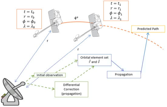 - Generate satellite positions. Using MATLAB’s “ode45” function to solve the differential two-body problem represented as Equation (33), we feed in the acceleration values calculated from step 3, and a time span to find the spacecraft’s position as a function of time.