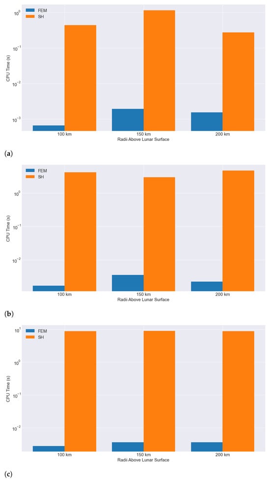 Computational time for the three tests for FEM and LP (100 × 100) SH approaches for each radius above the lunar surface. (a) Order of CPU time (s) for Test 1. (b) Order of CPU time (s) for Test 2. (c) Order of CPU time (s) for Test 3.