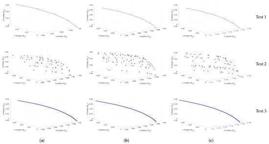 - Test 1: Randomized position changes. Using MATLAB’s “rand” function, we randomize a uniformly distributed pseudorandom set of values for and , i.e., the changes in azimuth and elevation, respectively. Using these randomized values, two ranges for and are created:With these simulated ranges and a radius 100 km above the lunar surface, these values are then converted into Cartesian coordinates to obtain starting x, y, and z positions of the simulated spacecraft.