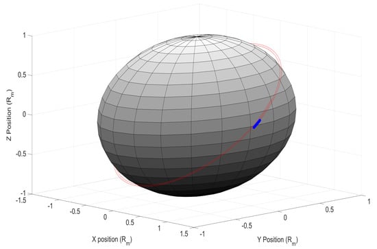 Finally, a long space orbit propagation was carried out for all three tests. For this, a time span of 360 min was used. Figure 18 shows the long-span predicted trajectory of the satellite, as apparent from Test 3 for a radius of 100 km above the lunar surface as an example. This long-span trajectory is shown in red, while the initial small shell trajectory is in blue. The shape of this conic section is representative of typical trajectories found with two-body applications: [56,57,58].