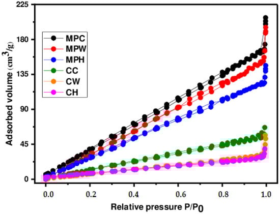 The nitrogen adsorption isotherms at 77 K for different biomasses (CC, CW, CH, MPC, MPW, and MPH) are shown in Figure 1, and the pore properties are detailed in Table 1. The adsorption and desorption isotherms for the various raw biosorbents changed gradually as the temperature of the wash water decreased for both materials. All biomasses exhibited type V isotherms, according to the IUPAC classification [,], which are characteristic of mesoporous adsorbents. These isotherms indicate low adsorbate/adsorbent interaction and the formation of multilayers at low pressure. For Maclura pomifera, the adsorption curves show that the volume of nitrogen adsorbed was significantly greater than that of wild carob, suggesting that Maclura pomifera has a more developed structure. This is confirmed by the results presented in Table 1, which show the significant differences in the textural properties of the two biosorbents.