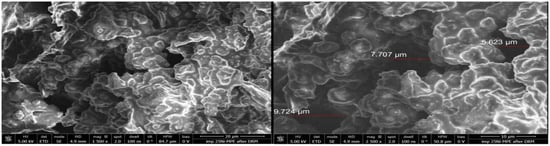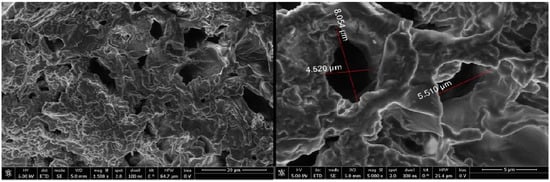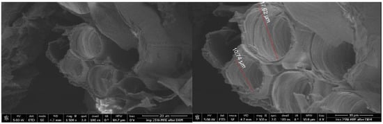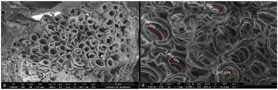 The microscopic scans of MPC, MPH, CC, and CH are shown in Figure 2, Figure 3, Figure 4, and Figure 5, respectively. Figure 4 and Figure 5 show that, at different magnifications, wild carob possesses a conductive vessel structure perfectly wound into a cylindrical spring. Conversely, the SEM images of MPC and MPH display a smoother morphology, a relatively heterogeneous surface, and the presence of cavities. Observation of the pore structure indicated that washing with hot water affected the structure of the biosorbents. However, it should be noted that the obtained images show merely the surface cavities and the external openings of the macropores.
