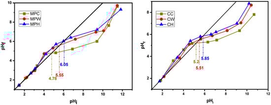 The obtained pHpzc values (Table 3) allowed for determining the acidic or basic nature of an adsorbent and, depending on the pH of the solution, its net surface charge [,,].
