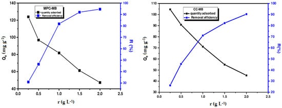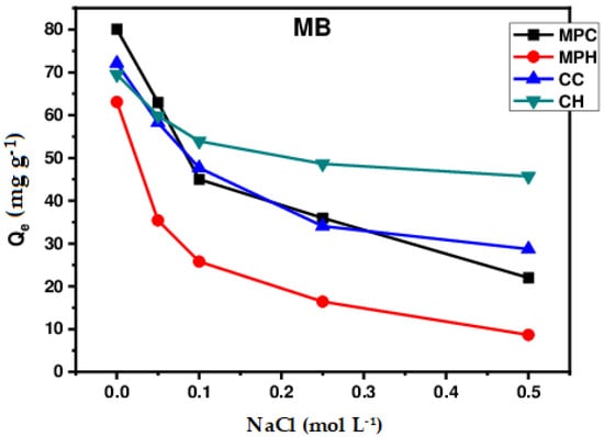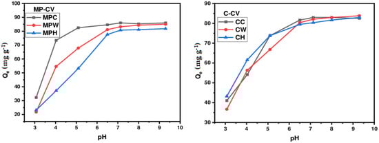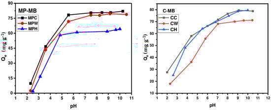 Table 2 presents the elemental composition of Maclura pomifera and wild carob washed with cold and hot water. These results show that the elemental composition of the adsorbents is typical of lignocellulosic material and is consistent with the findings often cited by other authors [,,]. However, it should be noted that MPH and CH contain a higher proportion of carbon and a lower content of heteroatoms. This can be explained by the elimination of soluble impurities at high temperatures. Various consequences may result from this change in the elemental composition of biosorbents, particularly in relation to their behavior in aqueous solution, such as the drop in the acidity of MPH and CH resulting from the reduction in oxygen content [].