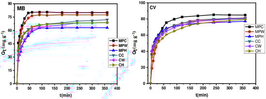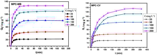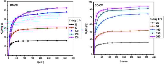 is the quantity adsorbed at time t (mg/g),  is the initial concentration of the dye solution (mg/L),  is the concentration of the dye solution at time t (mg/L), V is the volume of the solution (L), and m is the mass of the adsorbent (g)