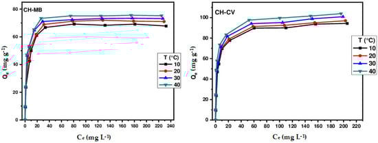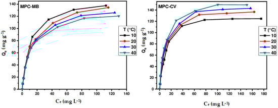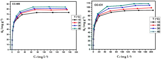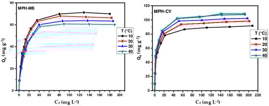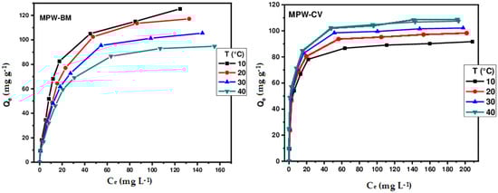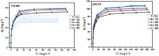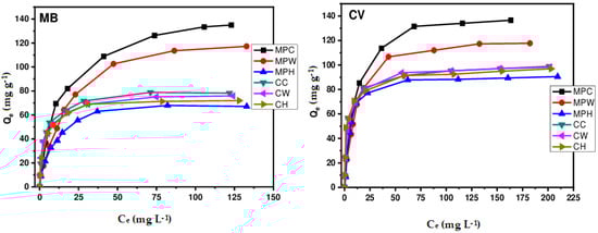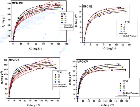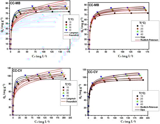 To elucidate the retention mechanism and identify the isotherm that best represents the adsorption of MB and CV on different biosorbents, four theoretical models were tested on the experimental results: Langmuir [], Freundlich [], Sips [], and Redlich–Peterson []. The equilibrium equations for these models are as follows: