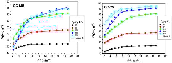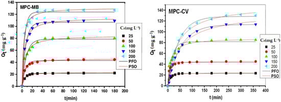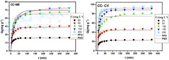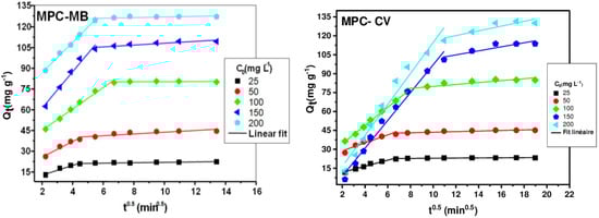 Several kinetic models were employed to interpret the experimental data, providing essential information for the use of different materials in the field of adsorption. Our results were analyzed using three widely used models: pseudo-first-order [], pseudo-second-order [], and intraparticle diffusion [] models. The main equations for these models are
