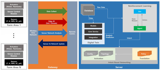 Figure 1 provides an overview of the intent-based IoT platform proposed in this study. This platform integrates machine learning and artificial intelligence to autonomously manage smart agricultural environments. By analyzing real-time environmental data and system feedback, the platform anticipates and adjusts key agricultural operations, such as irrigation, fertilization, and climate control. This platform enhances farming efficiency by enabling data-driven decision making with minimal manual intervention.