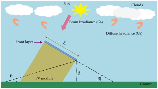 Schematic illustration of the incident irradiance with the two components (beam and diffuse) on the photovoltaic (PV) front surface. The module has a ground clearance of , a length of , and a tilt angle of .