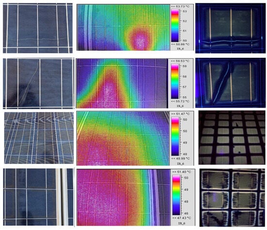 From top to bottom: Red–Green–Blue (RGB-left), Infrared (IR-middle), and ultraviolet fluorescence (UVF-right) images of a PV module affected by horizontal cracks, diagonal cracks, discoloration, and delamination, respectively [].