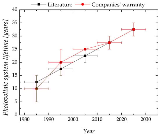 Having calculated the total physical degradation rate, , the model also provides an estimation of the lifespan of a PV module. To achieve this, the failure time is calculated by considering a loss of the order of 20% in the initial maximum output power according to the manufacturer and is given as follows []: