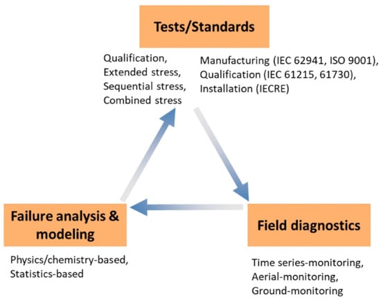 - PV components compatibility. The proper design and subsequent matching of all adjacent PV components is vital for the reliability, flawless performance, and extended lifespan of the module. Among all relevant components of the PV module, the backsheet and the encapsulant are more prone to degradation effects. It is, therefore, crucial to find a way to properly exploit the thermo-mechanical properties of these components []. In the primary stages of PV module operation, material incompatibilities included delamination, metal corrosion, and discoloration, i.e., yellowing []. However, over the past few years, the incorporation of new materials in PV field technologies has led to the expansion of material incompatibilities. For instance, specific combinations of polypropylene-based backsheets and polyethylene-based encapsulants comprise adhesion failures [], while acetic acid accumulation was connected to cracking formation and propagation []. In order to limit—or even eliminate, if possible—the compatibility problems inside a module, it is imperative to modify the already existing encapsulant-backsheet combinations or turn to the quest for new, well-promising ones with reinforced properties.