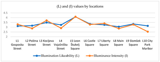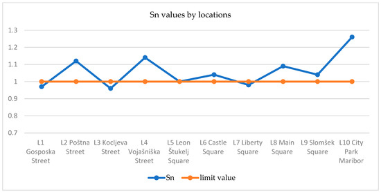 As seen in Figure 2, no location has a significantly low Sn value, indicating that the lighting of a location is perceived as too bright compared to its attractiveness. The majority of locations have an Sn value ≥1, indicating that the lighting compliance is achieved. This indicates that most of the locations have succeeded in balancing the illumination likability with the perceived brightness. No location is far below the threshold, three of them (L1 Gosposka Street, L3 Kocljeva Street, and L7 Liberty Square) are just below 1.00, indicating that lighting compliance has not been fully achieved in these areas. All three locations show a relatively high average value for illuminance intensity (l) value (3.30; 3.71; 3.40) compared to the other locations, but a relatively low illumination likability (L) value (3.12; 3.49; 3.25).