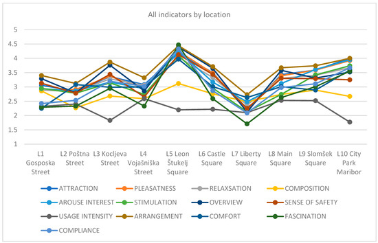 The data collected by a questionnaire were statistically processed and analyzed. The results in the Table 4, Table 5, Table 6, Table 7, Table 8, Table 9 and Table 10 represent the arithmetic mean and standard deviation σ evaluation according to the SEC model for 3 factors (psychological, sociological and aesthetic-functional), 7 indicators (individual feeling, attracting attention, orientation ability, sense of safety, land use, site aesthetic, and artificial light effect) and 13 aspects (attraction, pleasantness, relaxation, composition, arouse interest, stimulation, overview, safety, usage intensity, space arrangement, fascination, comfort, and compliance). The remaining two dimensions of the SEC model for the selected ten locations were not specifically studied in this context.