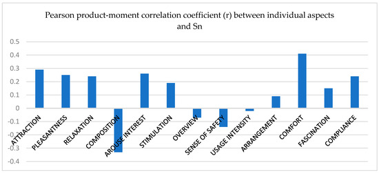 The validity of the sustainability coefficient Sn is also confirmed by the existing correlation between Sn and subjective indicators of environmental comfort. Figure 4 shows the correlation between psychological, sociological, aesthetic-functional factors and the Sn. The strength and direction of these relationships can provide insight into how changes in these aspects might affect Sn. The factors related to psychological aspects generally show a moderate correlation with Sn, whether positive or negative. Aesthetic-functional factors show varying correlations with Sn, with “comfort” showing the strongest positive relationship. As already shown in Figure 4, the correlation coefficient now confirms once again that sociological factors, in particular “Usage Intensity”, appear to have a negligible relationship with Sn.