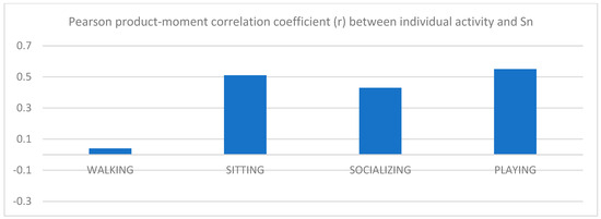 Since we cannot prove the correlation between Sn and the sociological factor as a whole, we check whether there is at least a partial connection between Sn and individual activities. The results in Figure 5 show a very high positive correlation between Sn and the activities “playing” and “sitting”. In contrast, the correlation with “walking” is almost negligible. The activity “socializing” also shows a moderate positive correlation, but this is weaker compared to “playing” and “sitting”.