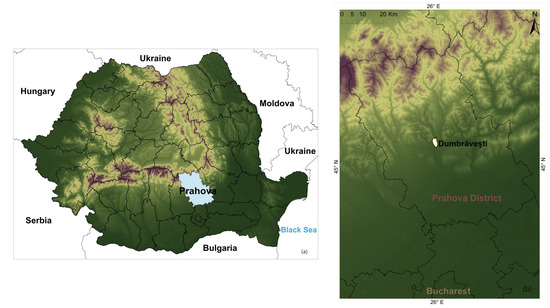 (a) Location of Prahova County in Romania; (b) location of Dumbrăveşti.