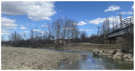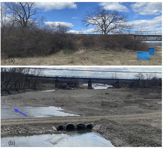 (a) Bridge over Vărbilău and the embankment; (b) bridge with three pillars and an opening of 100 m over the Vărbilău River. The blue arrow indicates the flow direction.