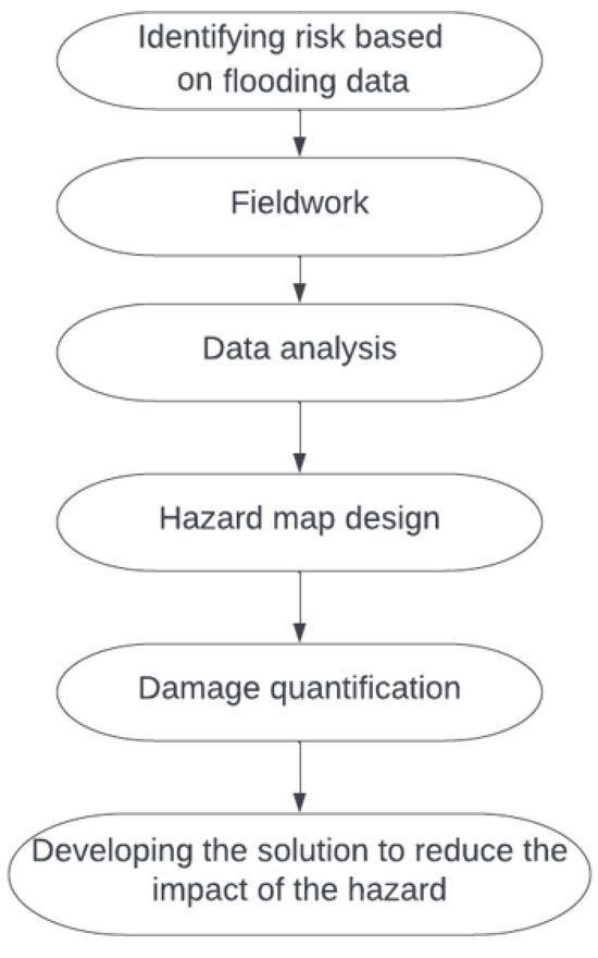 Figure 5 shows the stages of our study, starting from its goal, which is to determine factors that favor flood hazards, then quantifying the damages and providing a solution to reduce their impacts on settlements and terrains [36].