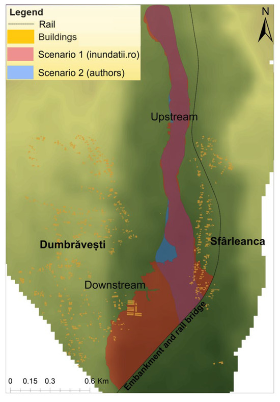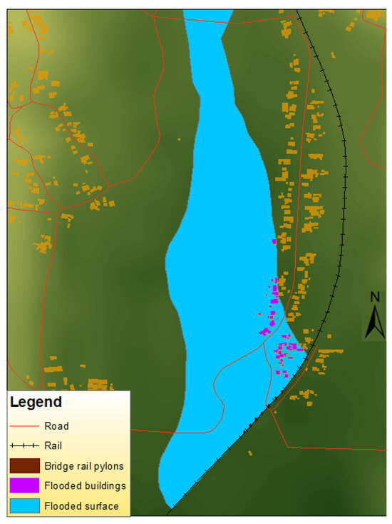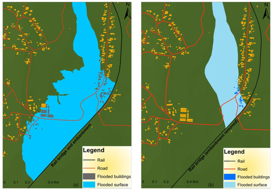 Table 1 contains the estimated damages. In the first scenario, the number of flooded buildings is 104, much higher than in the second scenario, where only 29 buildings would be flooded [52]. Also, the flooded surface of land would decrease from 0.66 km2 (the actual case) to only 0.38 km2 (Scenario 2). More than 10,000 m2 would be flooded in the current situation, whereas in Scenario 2, the surface is only 1729 m2.