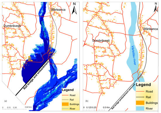 Figure 7a contains the flooding simulation in Scenario 1. In this case, the flooded zone is extended especially to the right bank of the Vărbilău River (that flows south towards Dumbrăveşti). This situation is favored by the existence of two embankments that act as a barrier and the small opening of the bridge (only 100 m). Thus, the flow space is reduced in the analyzed case, favoring the flood apparition. Suppose the embankment is shortened and replaced by a bridge with ten pillars (the existing three plus seven new ones for extending the actual length of the bridge). In that case, the situation improves, and the flooded surface is significantly reduced (Figure 7b).