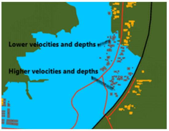 Other scientists determined and quantified the hazards’ effects based on different scenarios. In their article, Rahadiati et al. [25] analyzed the flooding impact on the houses located at a distance less than 100 m from a river in Indonesia, emphasizing the destruction of buildings, compromising of crops, infrastructure destruction, and the cessation of economic activities in the area. Loschner et al. [26] discussed the risk at a small scale produced by flows that can appear once every 100 and 300 years. Analysis has been carried out in floodplains where the expansion of neighborhoods is expected. Scenarios are analyzed to determine the exposure to floods.