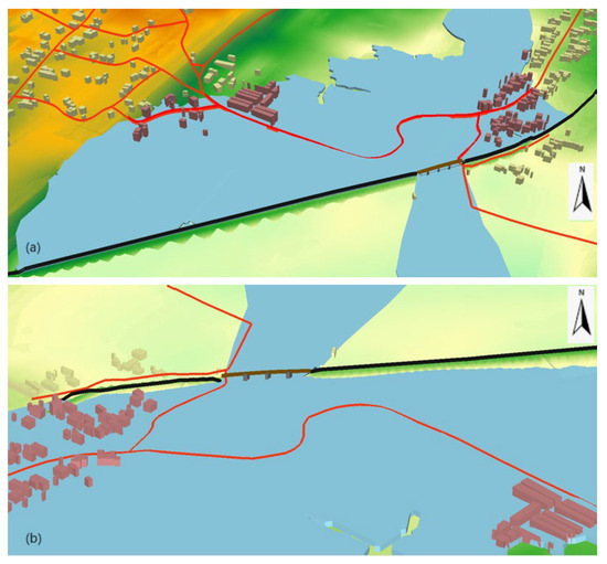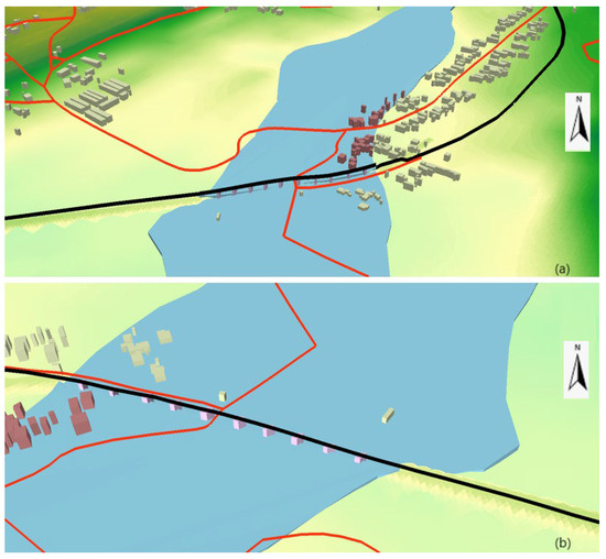 3D representation of the hypothetical situation for a flood with an exceedance probability of 1%. (a) View from the south of the flooded surface, embankments, extended bridge, and affected buildings with red; (b) zoom in from the northwest on the 10-pillar bridge.