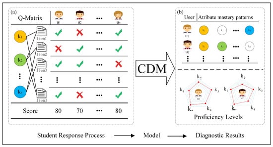 Example of a cognitive diagnostic process, used to infer and predict students’ level of mastery of knowledge concepts through cognitive diagnostic assessments. (a) Collection of student response data: The Q-matrix is transformed into test items, with student responses recorded. Circles in different colors represent distinct knowledge concepts or skills, and items denote test questions composed of these concepts. Solid connecting lines indicate the constituent relationship between items and the respective knowledge concepts or skills. (b) Visualization report of cognitive diagnostic results. Additionally, CDM refers to a specifically designated cognitive diagnosis model.