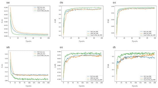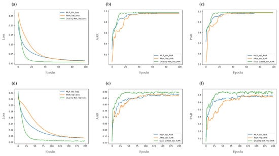 In Figure 3, we analyze how well the models performed overall across the test datasets. The overall performance of Dual Q-Net surpassed that of MLP and ANN in all cases. Firstly, Dual Q-Net achieved a lower loss than MLP and ANN on both high- and low-quality datasets, as shown in the sub-plot in Figure 3. Moreover, Dual Q-Net’s loss on the high-quality datasets converged faster and had smaller values than that of MLP and ANN. Furthermore, the same trend was observed with the low-quality datasets, where the loss performance of Dual Q-Net was more prominent than on the high-quality datasets. Secondly, in terms of model accuracy, Dual Q-Net was ahead of MLP and ANN for both AAR and PAR, as shown in sub-plots b, e, c, and f in Figure 3. In addition, it can also be observed that this advantage was particularly prominent on the low-quality datasets.
