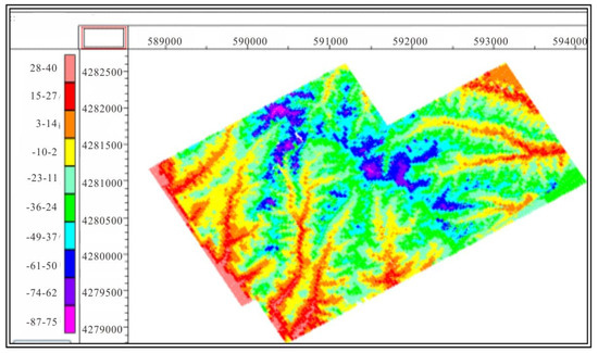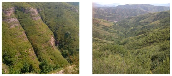 The research area of the 24 Mining District in Shanxi, China is characterized by low- to mid-mountain erosion and structural terrain. The mining field is located on the eastern foothills of the Luyashan Range, in the northern section of the Lüliang Mountains, with the Fen River to its east. The overall topography of the mining field is higher in the northwest and lower in the southeast. The highest point in the area has an elevation of 1715.079 m, while the lowest point is at 1402.472 m, resulting in a maximum relative height difference of 312.607 m. The surface layer mainly consists of exposed bedrock and Quaternary loess coverage, with localized colluvial deposits. Typical landforms of the exploration area are shown in Figure 1.