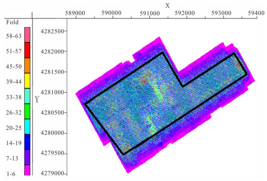 The design parameters were as follows: a 10-line, 8-source midpoint excitation fan-shaped observation system; each receiving line had 100 channels; the distance between receiving lines was 40 m; the receiving channel interval was 10 m; the lateral source interval was 20 m; the longitudinal source interval was 100 m; the CDP grid was 5 m by 10 m; and the coverage was 20-fold (4 times laterally, 5 times longitudinally), with an aspect ratio of 0.5 (Figure 3). In the study area, 21 source fans were deployed, covering an exploration area of 4.50 square kilometers, with a full coverage area of 4.87 square kilometers. A total of 2741 physical points were surveyed, with 2669 physical points for fan-line deployment and 72 points for testing at 4 sites.