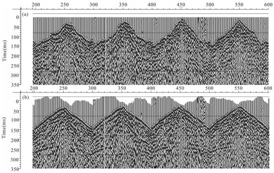 Comparison of static correction before and after: (a) before static correction; and (b) after static correction.