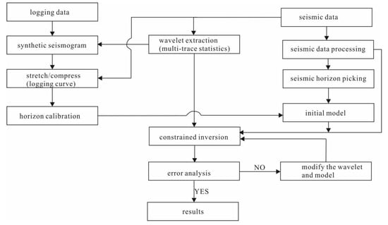 Seismic wave impedance inversion is a technique used to infer the wave impedance characteristics of strata (or rock layers) by utilizing seismic data [25]. This method links seismic reflection profiles with lithology and physical property profiles, enabling a comparison between seismic data and drilling data [26,27]. The technical process primarily includes the following steps: Initial Model Setup: Set an initial wave impedance model of the strata and perform seismic forward modeling to generate synthetic seismic records. Comparison and Adjustment: Compare the synthetic records with actual seismic data to adjust the main parameters of the geological model. Perform forward modeling again to obtain new synthetic records. Iteration: Continuously compare the new synthetic records with the actual seismic records, iteratively modifying the geological model until the synthetic seismic data best match the actual seismic records. The geological model obtained when the error is minimized is considered the result of the wave impedance model inversion, as shown in Figure 5.