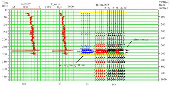Comparison between synthetic records and seismic profiles: (a) density log; (b) velocity log; (c) seismogram synthesis; and (d) seismic trace.