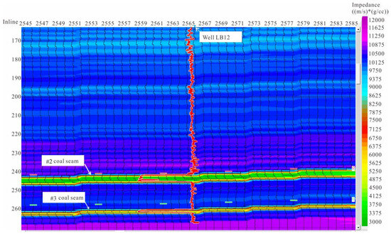 The precision of seismic stratigraphic interpretation directly influences the lateral resolution of the initial model, while seismic sampling rate is the primary factor affecting vertical resolution. Utilizing high-frequency information from well-logging enables detailed description of geological thin layers, often requiring densification of seismic data sampling. To meet the high vertical resolution requirements for reservoir identification, the seismic data sampling rate is increased to 0.5 to 1 ms. In constrained inversion, ensuring minimal error between observed seismic data and synthetic records calculated by the model involves employing a hard constraint approach, which bounds the final impedance values within a specified range of variability. The wave impedance values at borehole LB12 (see Figure 10) indicated that the wave impedance of the coal seam was relatively low compared to the wave impedance of the roof and floor. The inversion profile accurately identified the boundaries of the coal seam; the results at the borehole location aligned perfectly with the well log data. In this parameter testing, a hard constraint of 25% resulted in relatively small overall errors. Throughout this process, the average block size was chosen to match the sampling interval (1 ms).