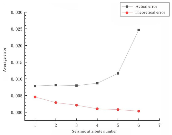 In Figure 11, the horizontal axis represents the number of seismic attributes, while the vertical axis represents the average error. It can be observed that when the number of attributes increases to five, the actual error significantly rises. Therefore, it is concluded that additional attributes beyond the fourth attribute may lead to overfitting. Hence, the optimal number of attributes was determined to be four.
