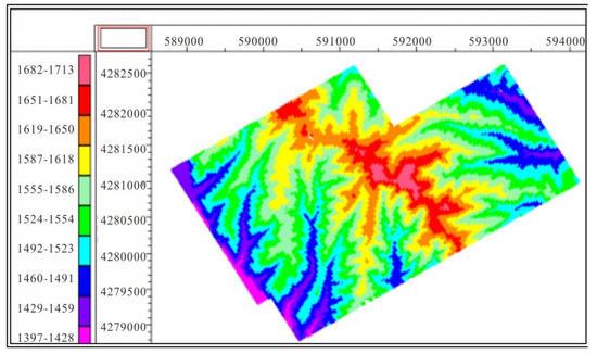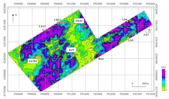 In this study, the BP neural network served as the model for the coal thickness outcome prediction (Figure 12), which aligned closely with the actual results. The coal thickness at drill hole locations is represented in red. From the thickness variation trend map of the No. 2 coal seam, it can be observed that the thickness of the No. 2 coal seam ranges from 0.12 m to 6.84 m. The thinnest section is located in the northwest corner within the erosion zone, while the thickest section is found near the boundary in the southwest corner. The thin layers are distributed in an irregular banded pattern.
