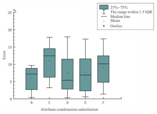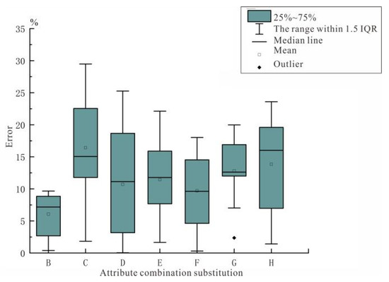 In Figure 14 and Figure 15, the x-axis labels “B” represent the original system’s optimized attribute combinations, while other letters denote alternative combinations. “IQR” represents the interquartile range, a commonly used statistical measure to assess data variability. The IQR is the difference between the third quartile (upper quartile) and the first quartile (lower quartile). A range of 1.5 times the IQR is often used to identify outliers. Comparing the relative errors in Figure 13 and Figure 14 revealed the following: