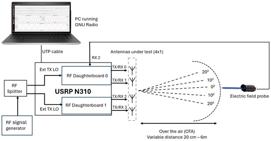 A small dimension Aaronia PBS1 electric field probe [21] with a sensor diameter of 3 mm was connected to one RX channel of the USRP device. The E field probe is used to measure the amplitude received over the air (OTA) at different azimuthal points in a semicircle. The distance between the AUT and the receiving E field probe could be varied between 20 cm and 6 m, depending on the length of the RF cable used for connecting the E field probe to the USRP RX channel. The measurement distance should be chosen to meet the far-field criteria (2D2/λ), calculated according to the operating frequency/wavelength (λ) and the device under test dimension (D). Thus, given the minimum operating frequency of 300 MHz, 6 m should be considered sufficient to meet the far-field criteria for a device under test with a maximum dimension of 3 m. A computer running Ubuntu with GNU Radio 3.10.7 open-source software [22] was used to control the USRP. Figure 2 presents the diagram of the proposed system architecture.