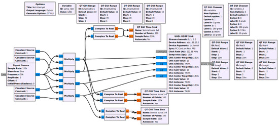 A customized user interface was designed in GNU Radio for setting the individual phases and amplitudes of the four USRP RF channels used for transmission (TX). The GNU Radio flowchart used for transmission is depicted in Figure 3.