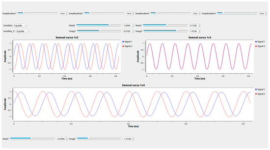 The amplitude of each individual channel can be modified by setting the value of the gain parameter in the USRP Sink block, also configured by a QT GUI type variable. The user interface obtained after running the GNU Radio flowchart is presented in Figure 4, enabling real-time setting of amplitude and phase for USRP TX channels 1–4.