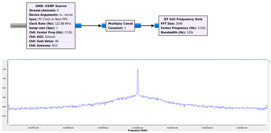 The RX channel is also configured within GNU Radio, according to the flowchart presented in Figure 5 (top), by setting a USRP source on the center frequency of 3.53 GHz and using a QT GUI Frequency Sink type block. The lower part of Figure 5 presents the corresponding frequency spectrum, with the measured 3.53 GHz continuous signal. With the E field probe connected to the USRP RX channel and the flowchart running, the variation in the amplitude received can be observed in real−time.