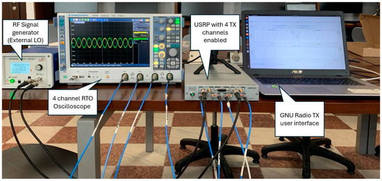 The phase variation was validated using an Rhode&Schwartz(R&S) RTO2064 oscilloscope featuring four channels (CH), 6 GHz bandwidth, and 20 GSa/s maximum sample rate. The four TX channels of the URSP were connected by RF cables (same type and length) to each of the four oscilloscope channels. Figure 6 presents a picture of the experimental setup used for phase alignment of the four USRP TX channels, with one group of channels (CH1 and 3) being set out of phase compared to the other group of channels (CH2 and 4).