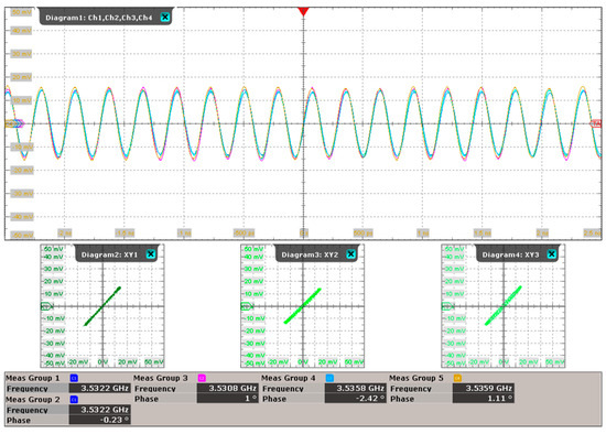 Figure 7 presents the result of the phase calibration for 3.53 GHz frequency after the values of the complex constants were set to correspond to 0° phase difference between the four TX channels. The signal waveforms were displayed as time domain diagrams and as an XY type diagram. In the XY type diagram the signal on the X axis was set to channel 1 and the signal on the Y axis to channels 2, 3, and 4, respectively.