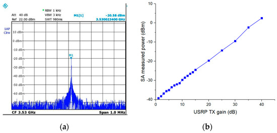 The amplitude calibration of the TX channels was performed with an R&S FSV3013 SA. Figure 8a presents an example of the measured 3.53 GHz frequency signal for a gain value of 20 dB (TX1), with the visible SA settings and TX channel directly connected by RF cable. Figure 8b presents the amplitude linearity measured for one of the USRP TX channels.